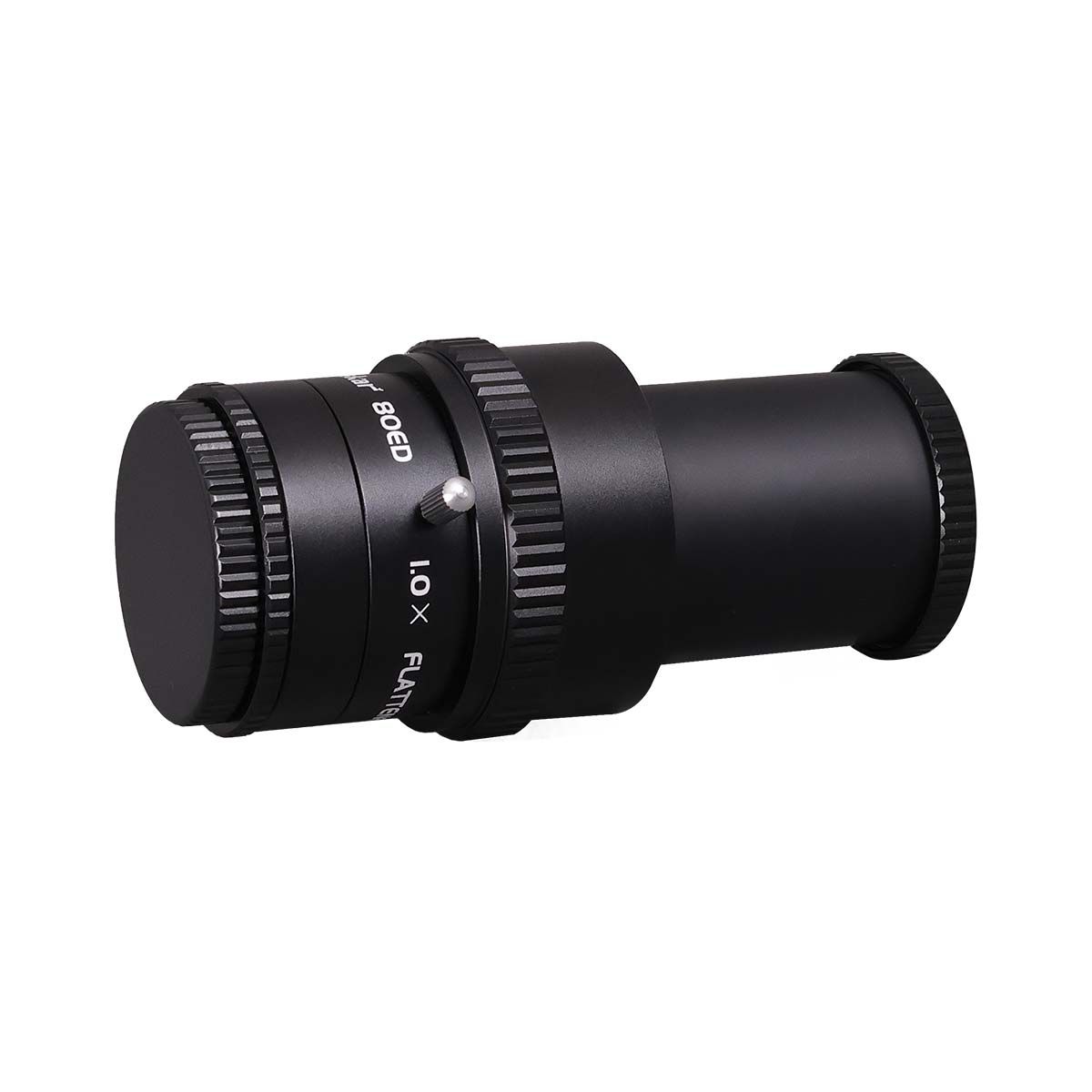 Fabricado con precisión, este aplanador de campo Askar 80ED está mecanizado completamente por CNC para ofrecer el máximo rendimiento óptico y durabilidad. Luce un elegante acabado negro y proporciona una montura sólida para su sistema de imagen. A pesar de su robustez, la unidad completa pesa solo 0,42 kg. En la parte posterior de este aplanador de campo, encontrará un rotador de 360°, una práctica función para encuadrar sus objetivos. La fijación de filtros es rápida y sencilla gracias a la rosca integrada de 2″, y se alcanza fácilmente el estándar de la industria de 55 mm de enfoque posterior requerido desde la rosca M48 trasera. Dos tapas metálicas roscadas protegen las lentes ópticas cuando no se utilizan.