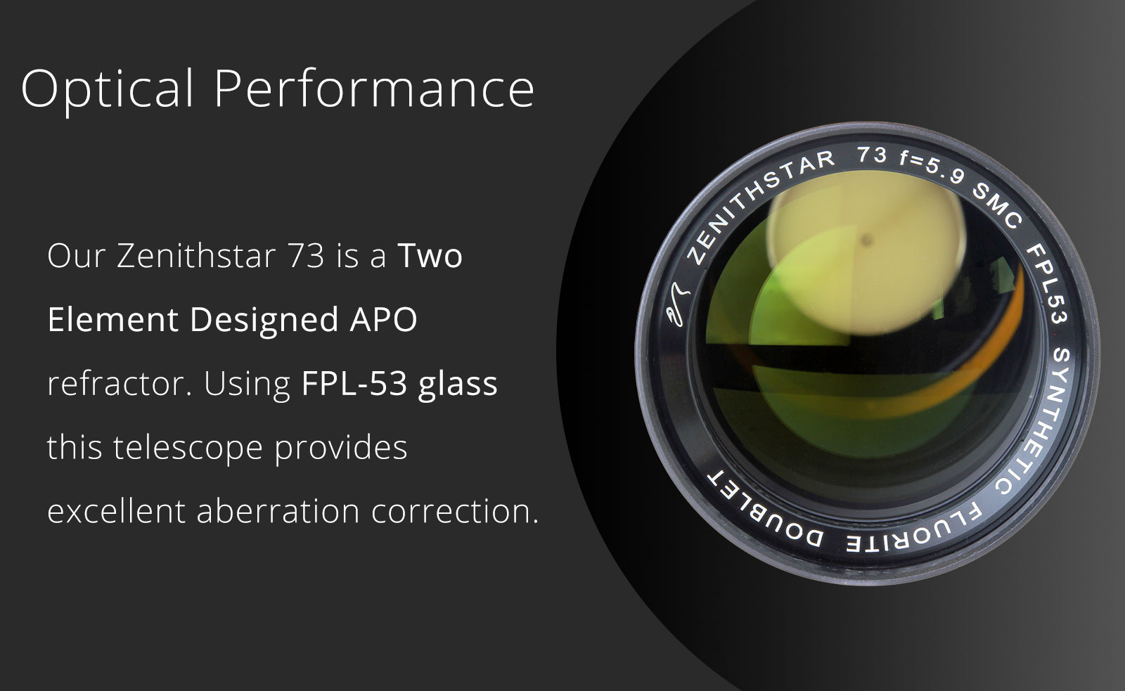 Zenithstar 73 es un telescopio refractor enormemente versátil y portátil para principiantes y veteranos. Diseñado tanto para la fotografía astronómica como para la fotografía de vida silvestre, la observación visual de alta potencia a través del Zenithstar 73 también es sumamente satisfactoria.