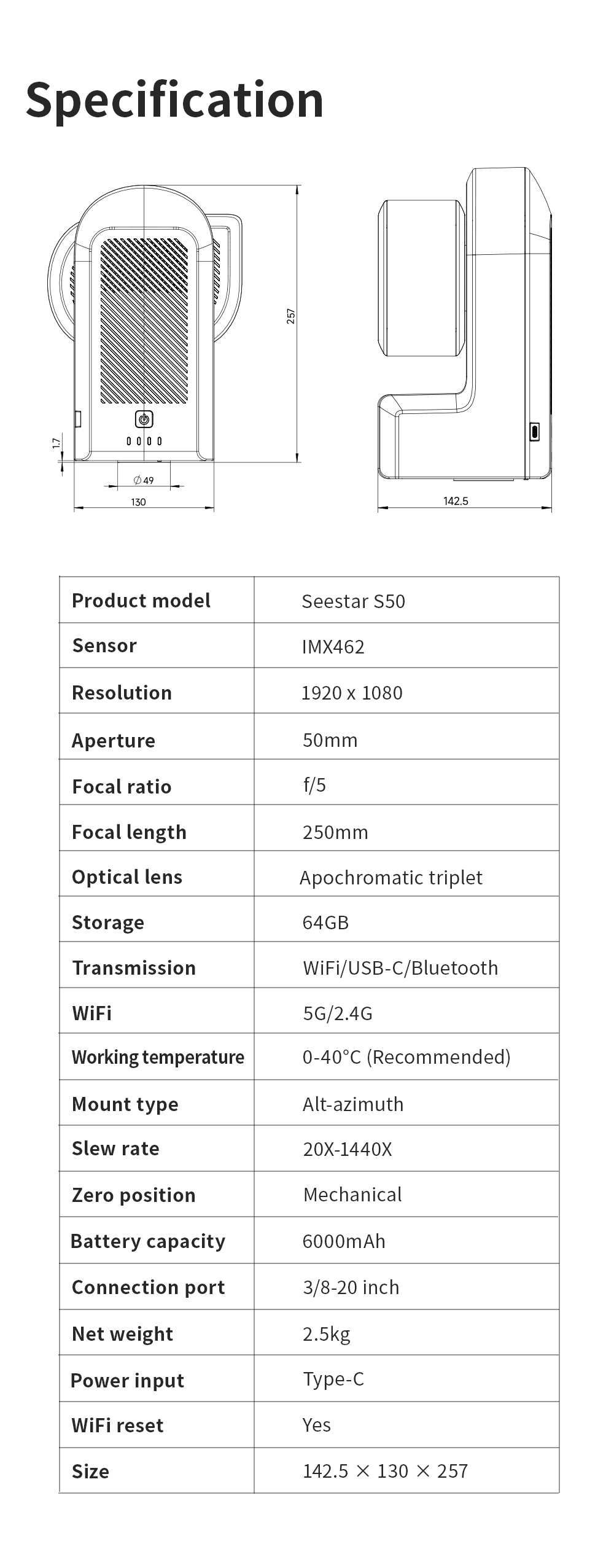 Lista completa de especificaciones del ZWO SeeStar S50